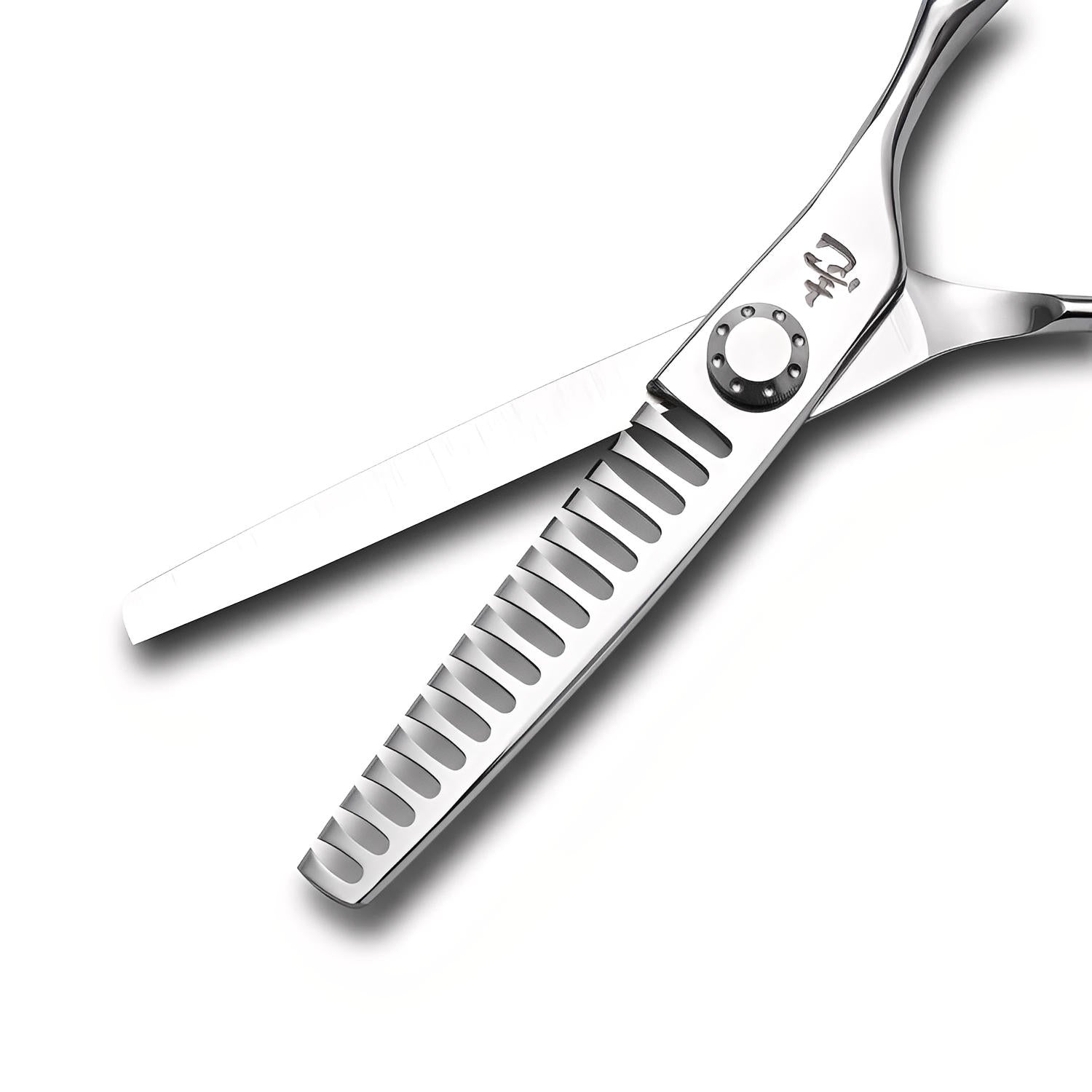 "Ichiro Premium Series: Taiyo VG10 Texturizing Scissors excel in creating texture and volume with precision. The 15 texturizing teeth are particularly effective for chunking and thinning techniques. These versatile scissors also perform admirably in point cutting, adapting well to various texturizing methods. Their ergonomic design makes them comfortable for extended use, making them indispensable for achieving modern, textured styles in professional settings."